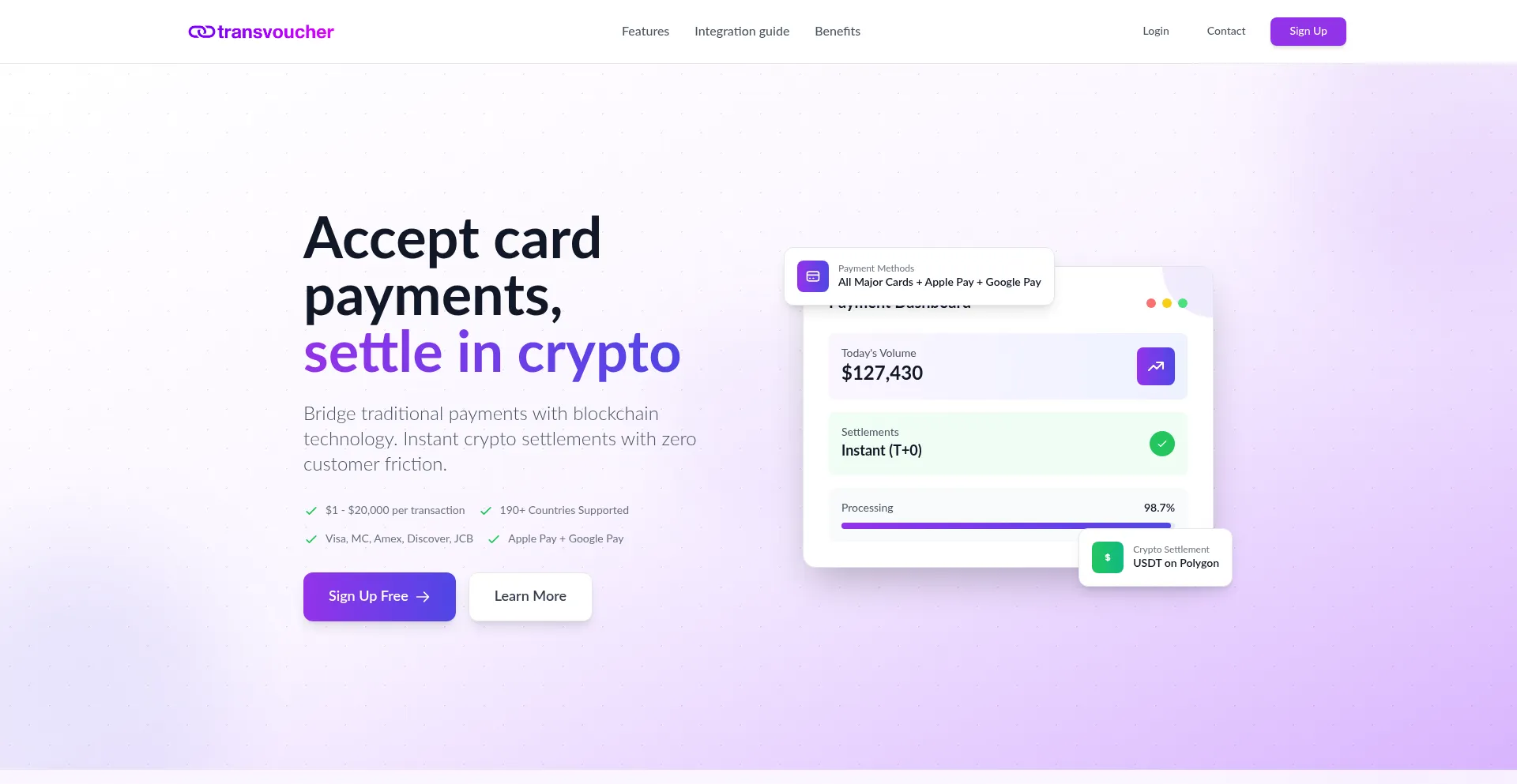 Bridge traditional payments with blockchain technology. Instant crypto settlements with zero customer friction.