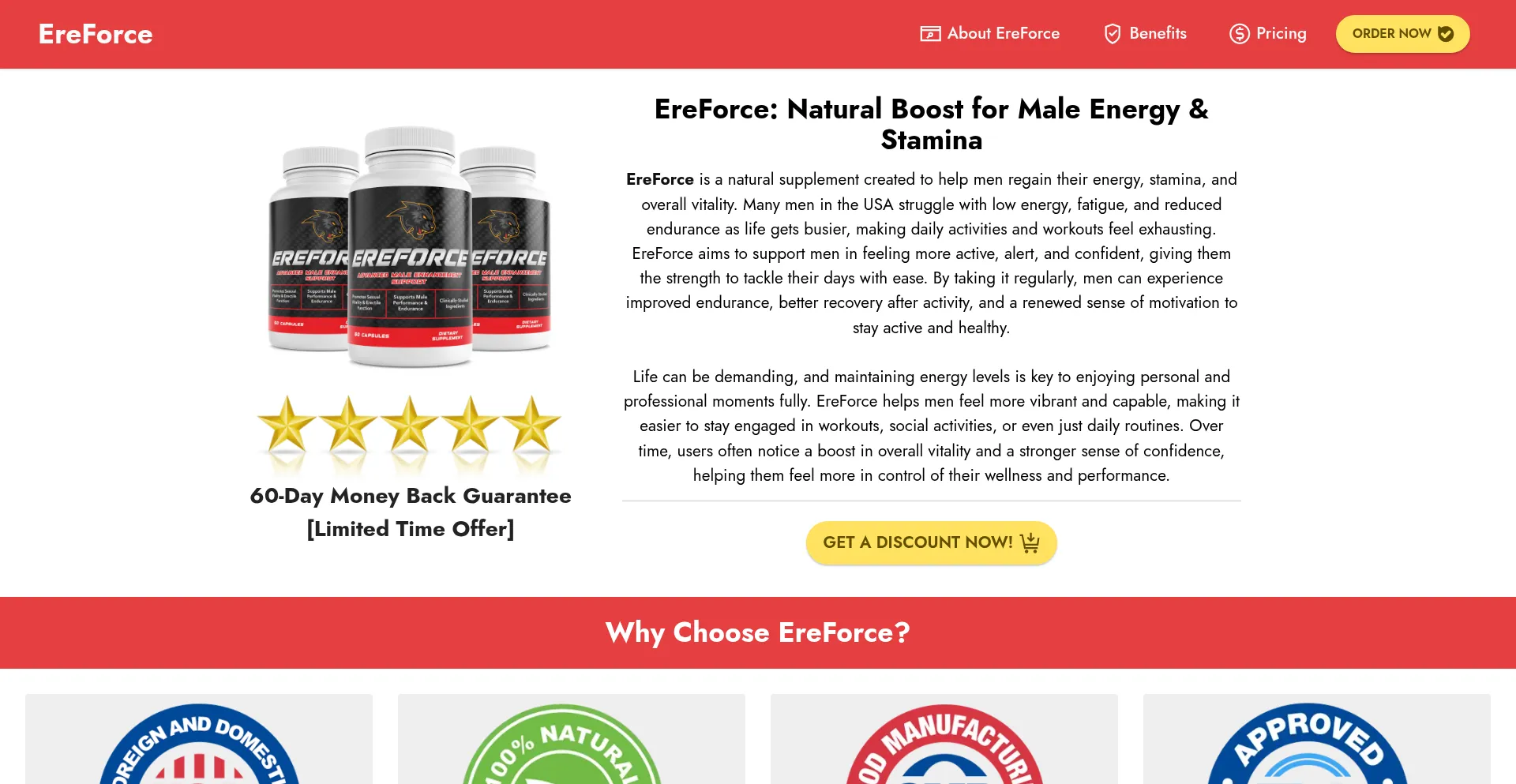 EreForce boosts male energy, stamina & vitality naturally. Made in the USA with safe, non-GMO ingredients for stronger performance and wellness.