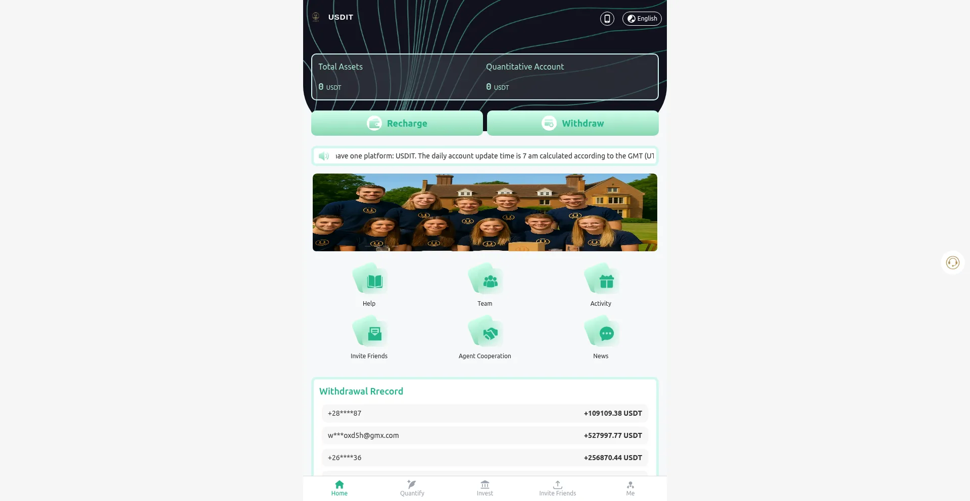Usdit.com opère une plateforme financière frauduleuse promouvant des opportunités d'investissement trompeuses avec des promesses de rendements irréalistes. L'analyse de sécurité indique que la plateforme emploie des tactiques cohérentes avec les schémas de Ponzi et la fraude à l'avance de frais conçus pour extraire les fonds des utilisateurs et les informations personnelles.