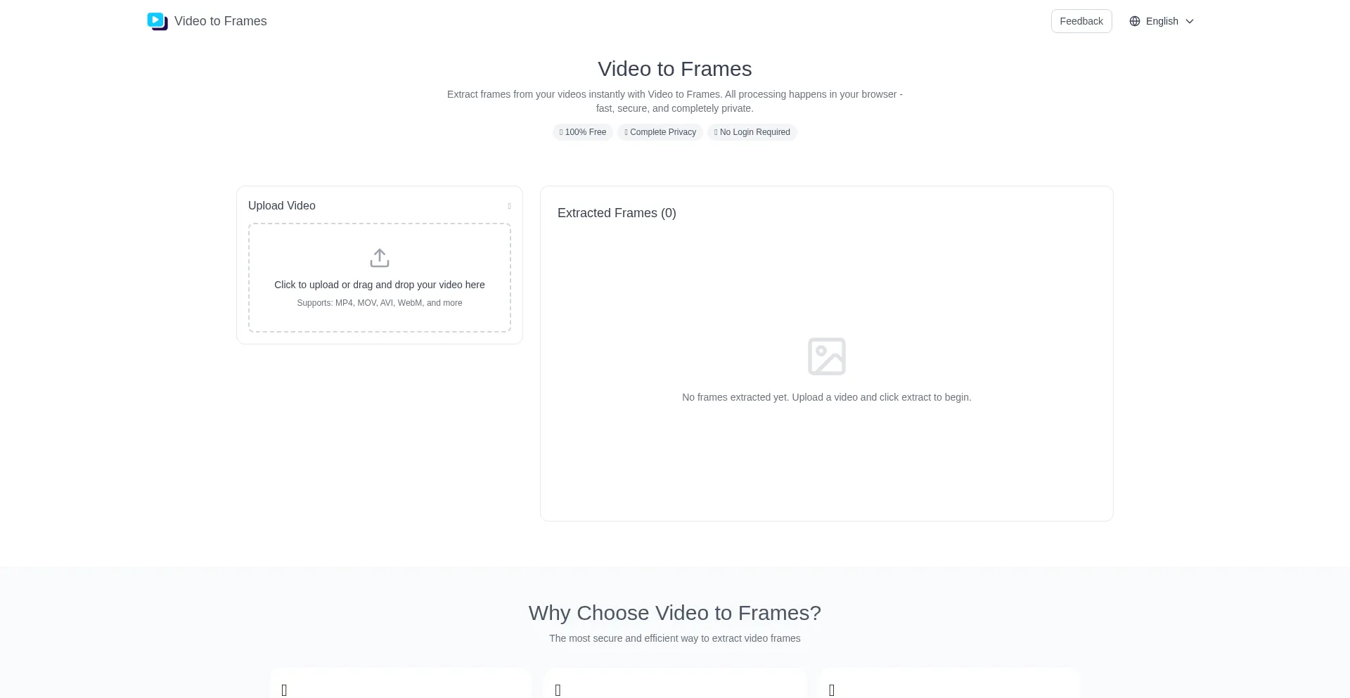 Video to Frames - Free tool to extract frames from videos. Convert video to frame images at any FPS. Browser-based, secure, 100% private.
