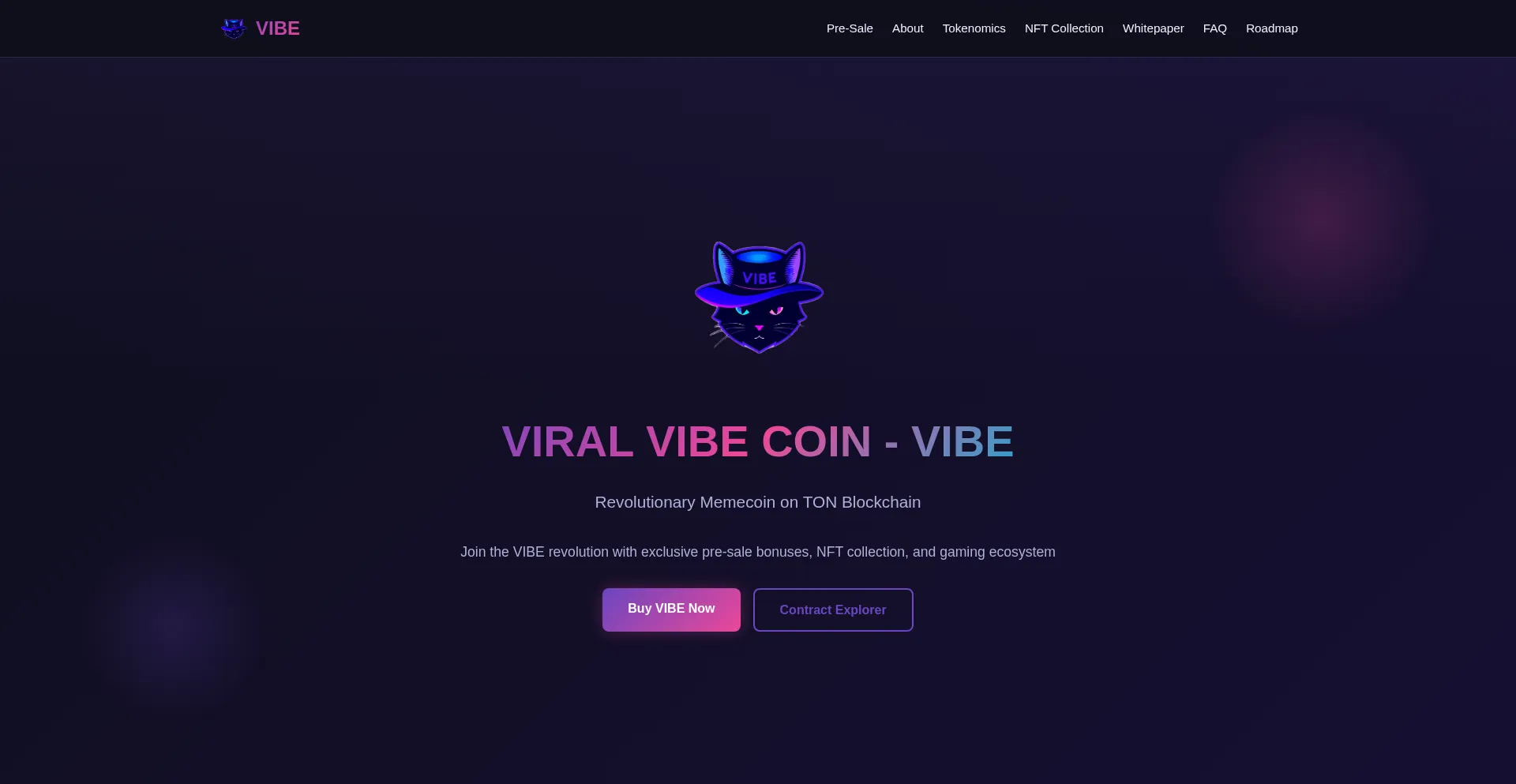 VIBE - Revolutionary Memecoin on TON Blockchain. Join the VIBE revolution with exclusive pre-sale bonuses, NFT collection, and gaming ecosystem.