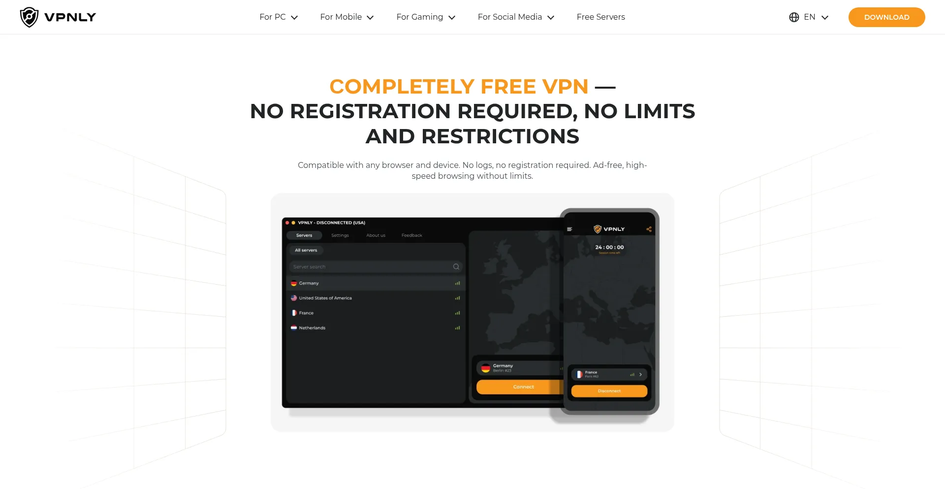VPNLY is a completely free VPN that provides you with reliable protection and anonymity online. No registration and no limits on traffic and speed.