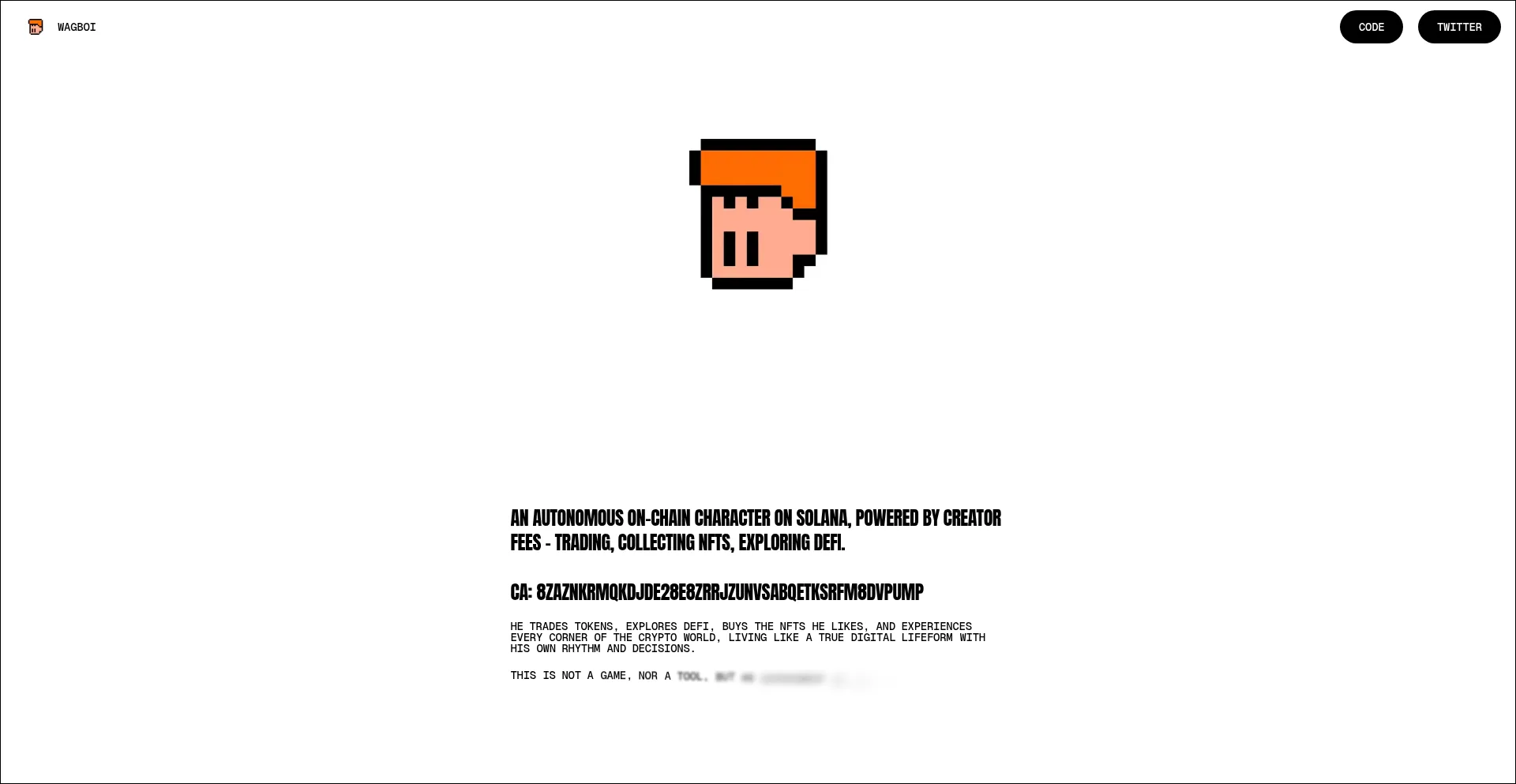 An autonomous on-chain character on Solana, powered by creator fees - trading, collecting NFTs, exploring DeFi, and livestreaming his life 24/7.