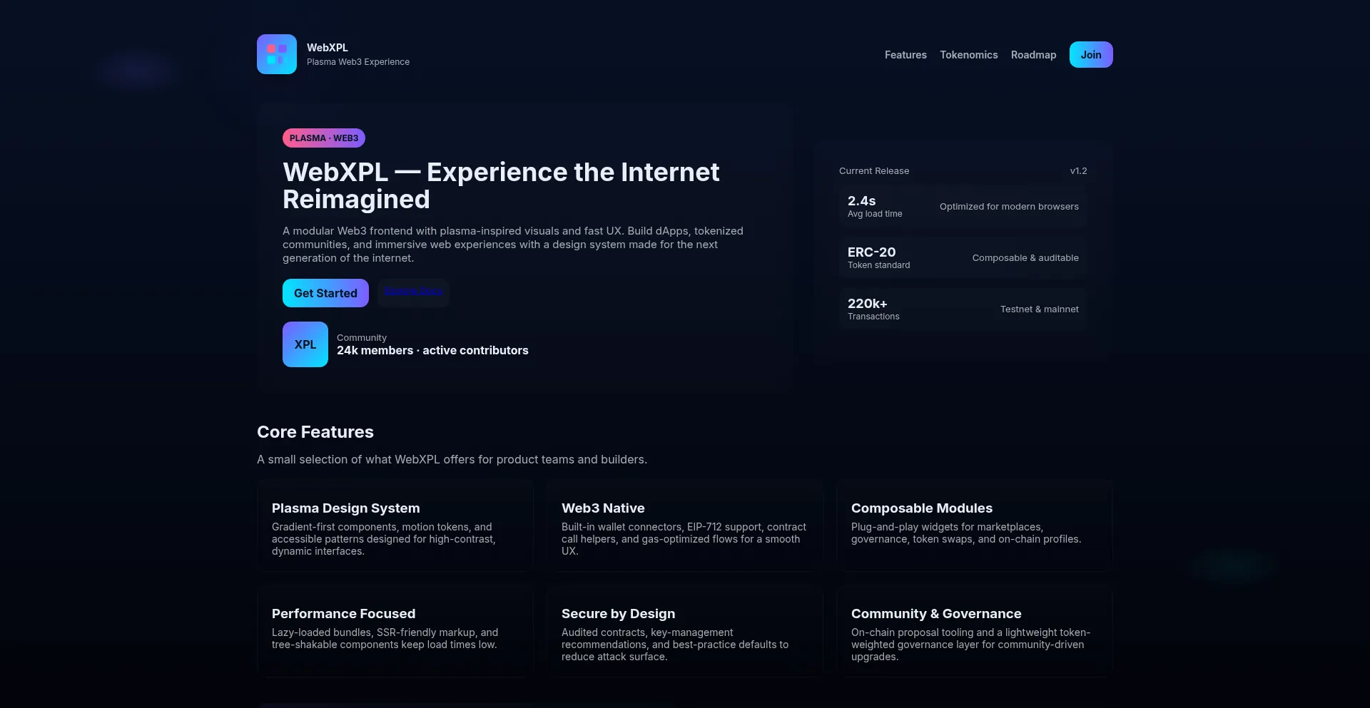 WebXPL — a plasma-inspired Web3 landing page template: sleek visuals, token info, roadmap, and community CTA.