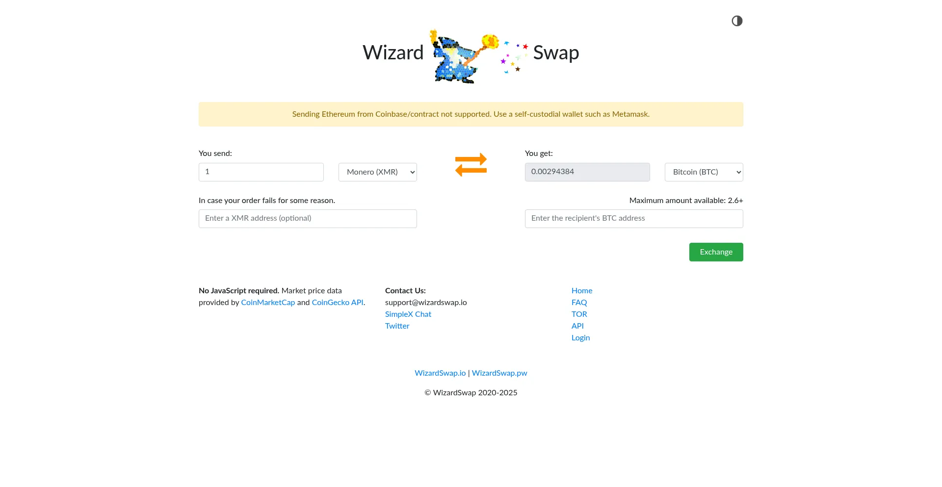 exchange bitcoin, monero, ethereum, zcash, dash, litecoin, particl, pivx, firo, no registration - wizardswap.io