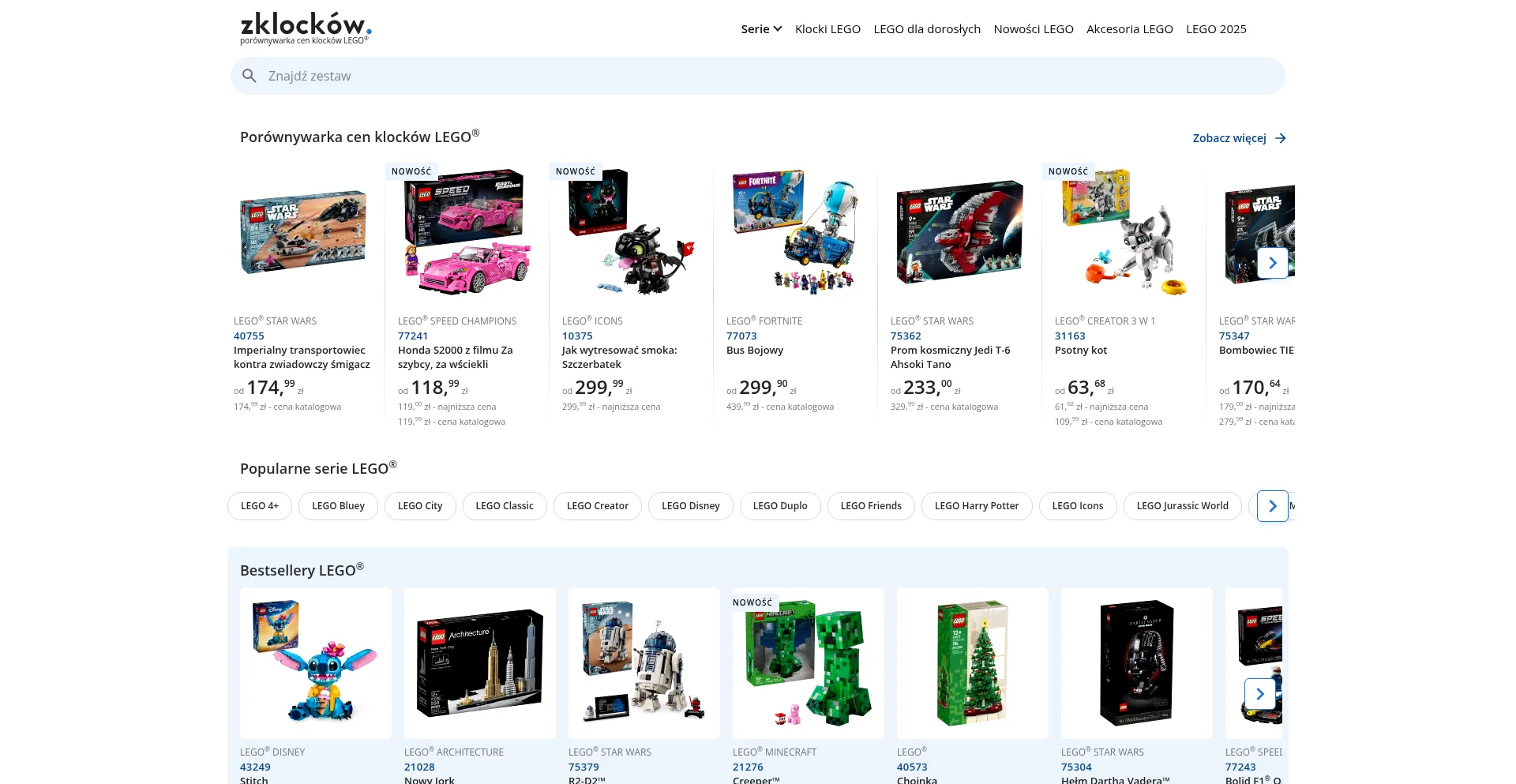 ZklockĂłw.pl to największa w Polsce porĂłwnywarka cen klockĂłw LEGO. Szukaj, odkrywaj, porĂłwnuj, kaĆŒdego dnia setki zestawĂłw w najniĆŒszych cenach.